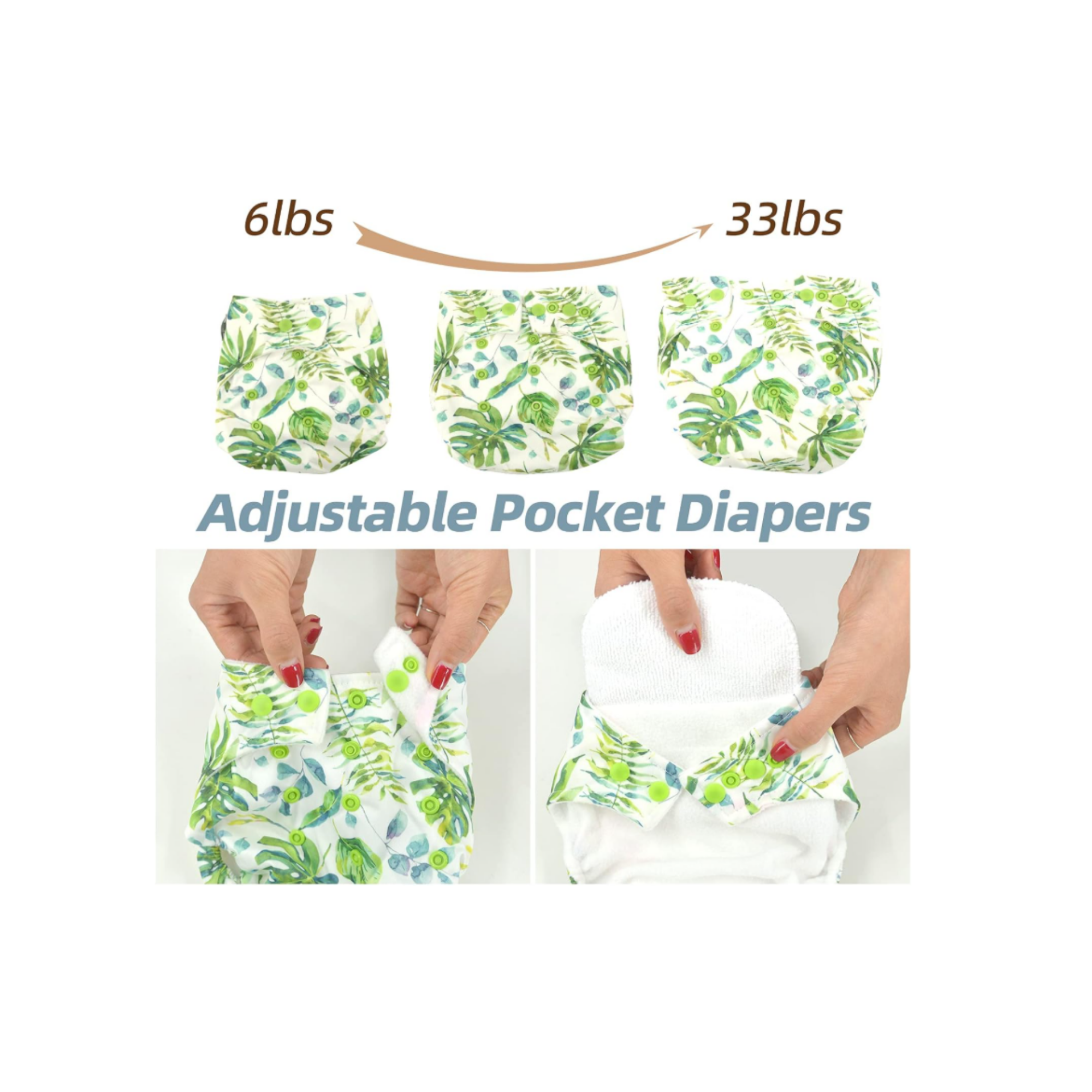 The magic button design makes these nappies fully adjustable to fit newborn right through to toddler.  Simply adjust the nappy according to the size you need.  From small to medium to large to extra large ALL IN ONE NAPPY.